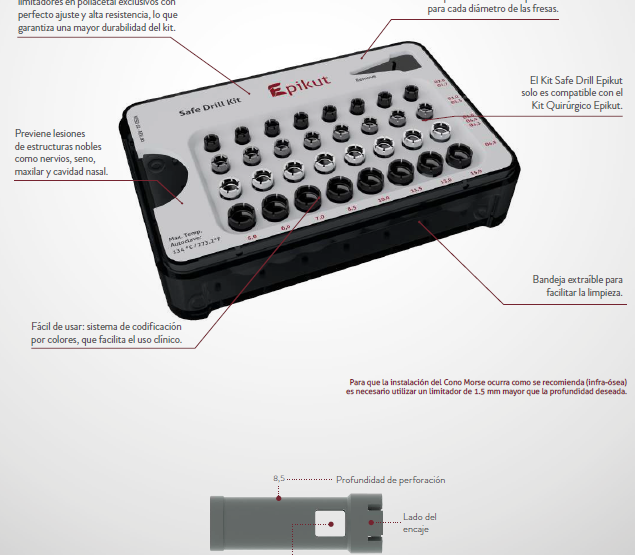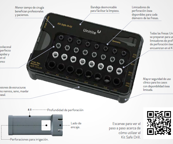 El Kit Safe Drill sólo es compatible con el kit quirúrgico Unitite®. Para la instalación infraósea del Cono Morse se requiere el uso de una